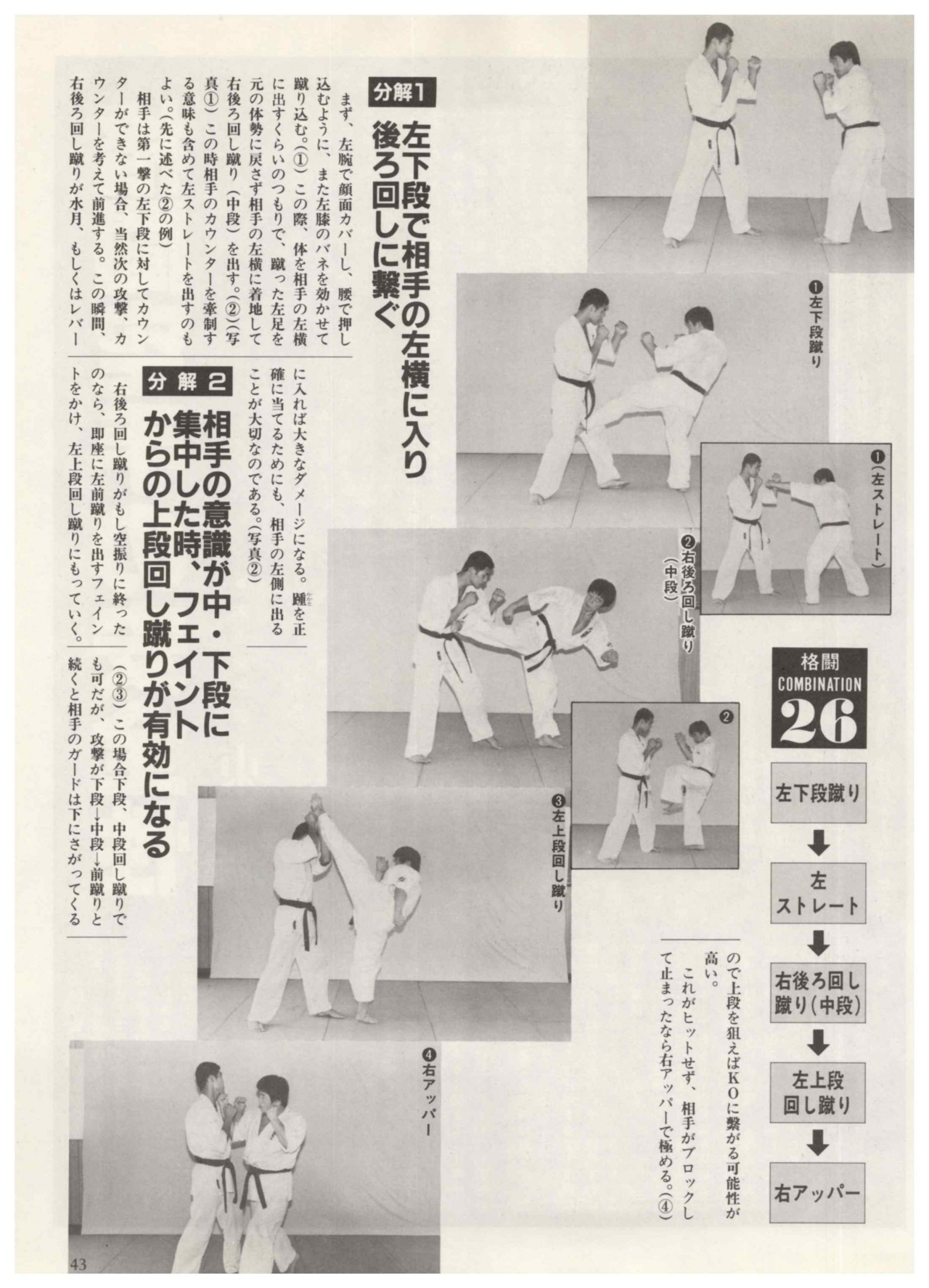 まず、左腕で顔面カバーし、腰で押し込むように、また左膝のバネを効かせて蹴り込む。(1)この際、体を相手の左横に出すくらいのつもりで、蹴った左足を元の体勢に戻さず相手の左横に着地して 右後ろ回し蹴り(中段)を出す。(2)(写真1)この時相手のカウンターを牽制する意味も含めて左ストレートを出すのもよい。(先に述べた2の例)