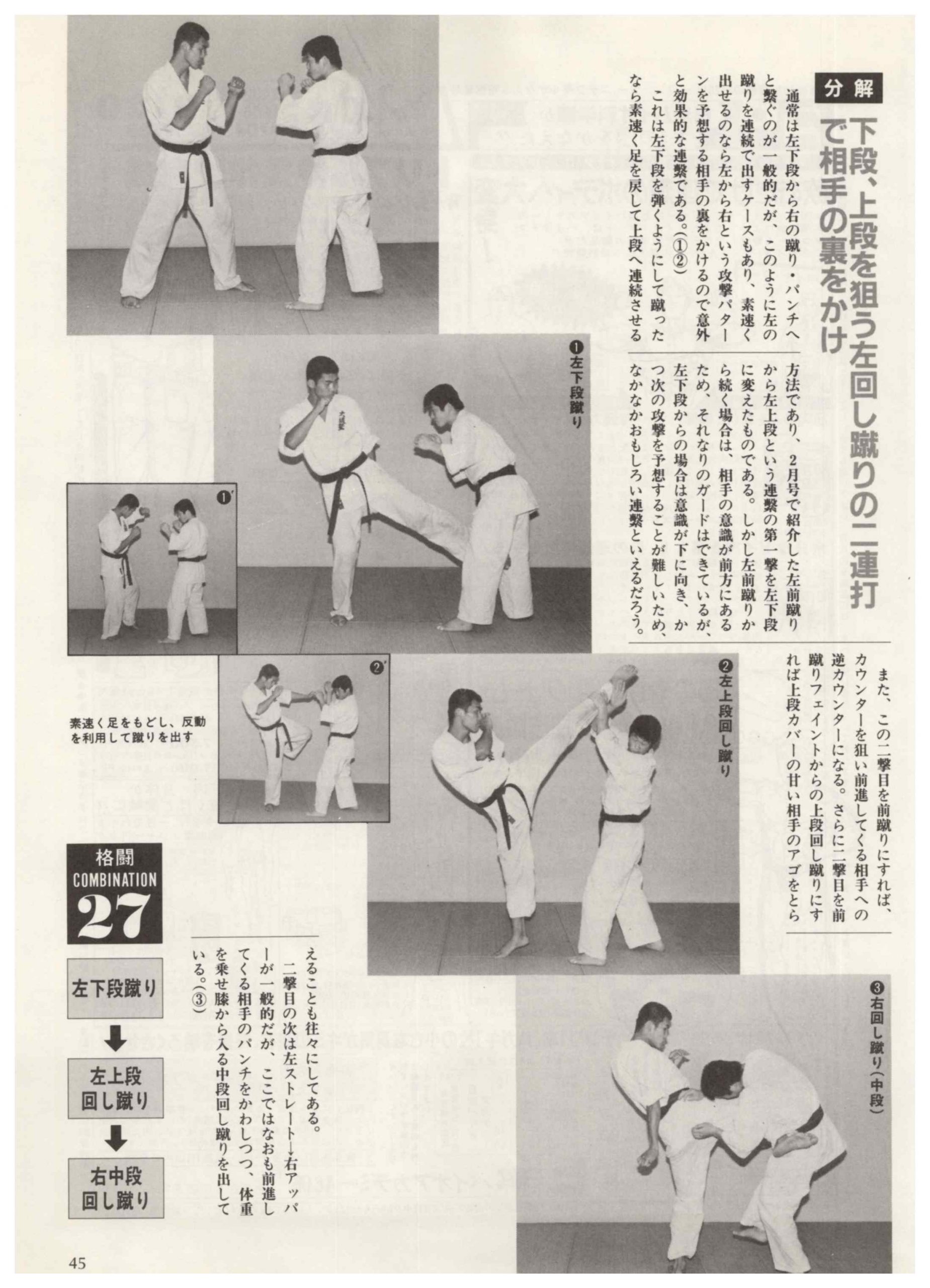 通常は左下段から右の蹴り・パンチへと繋ぐのが一般的だが、このように左の蹴りを連続で出すケースもあり、素速く出せるのなら左から右という攻撃パターンを予想する相手の裏をかけるので意外と効果的な連繋である。(1)(2)