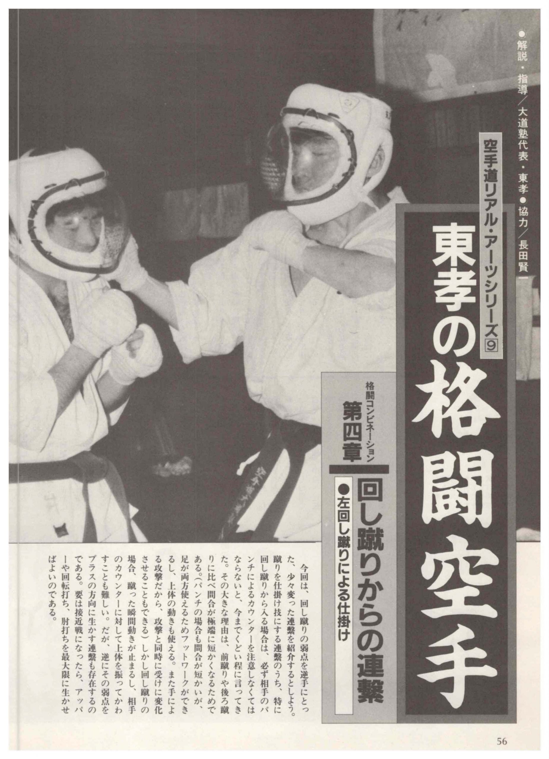 東孝の格闘空手 空手リアルアーツシリーズ ⑨ VOL1 2026年3月26日 by 大道無門 この連載は『月刊空手道』(福昌堂発行)1985年6月号に収録されたものです。肩書は掲載当時のものです 解説・指導 大道塾代表・東孝 ●協カ 長田賢一 一空手道リアル・アーツシリーズ⑨21世紀の空手!格闘空手の総帥・東孝が公開する超実戦空手のスーパーテクニック講座第9弾 格闘コンビネーション第四章第四章 回し蹴りからの連繋 3左回し蹴りによる仕掛け 今回は、回し蹴りの弱点を逆手にとった、少々変った連繋を紹介するとしよう。 蹴りを仕掛け技にする連繋のうち、特に回し蹴りから入る場合は、必ず相手のパンチによるカウンターを注意しなくてはならないと、今までくどい程に言ってき た。その大きな理由は、前蹴りや後ろ蹴りに比べ間合が極端に短かくなるためである。(パンチの場合も間合が短かいが、足が両方使えるためフットワークができるし、上体の動きも使える。また手による攻撃だから、攻撃と同時に受けに変化させることもできる)しかし回し蹴りの場合、蹴った瞬間動きが止まるし、相手のカウンターに対して上体を振ってかわすことも難しい。だが、逆にその弱点をプラスの方向に生かす連繋も存在するのである。要は接近戦になったら、アッパーや回転打ち、肘打ちを最大限に生かせばよいのである