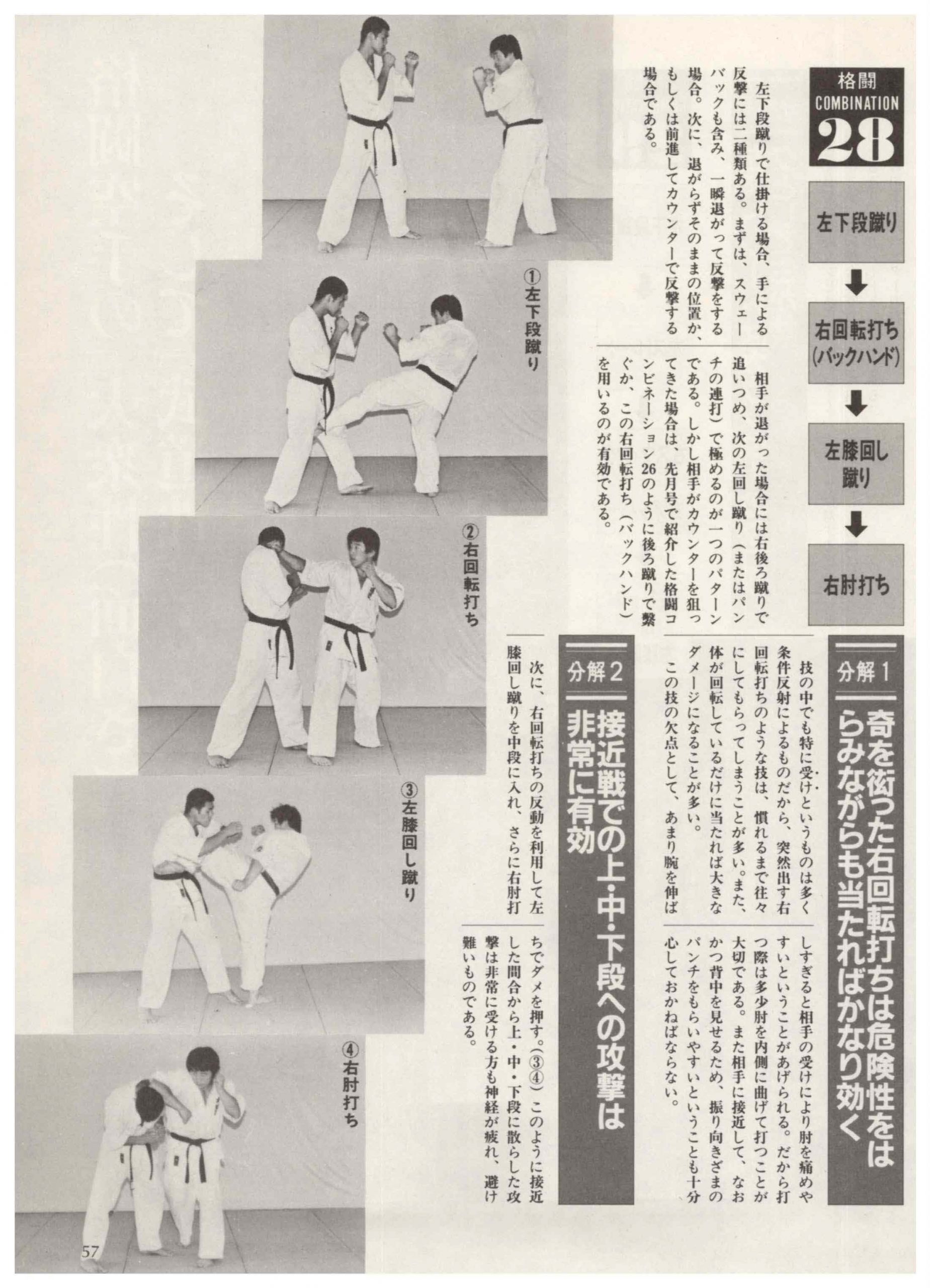 東孝の格闘空手 空手リアルアーツシリーズ ⑨ VOL2 2026年3月27日 by 大道無門 この連載は『月刊空手道』(福昌堂発行)1985年6月号に収録されたものです。肩書は掲載当時のものです 解説・指導 大道塾代表・東孝 ●協カ 長田賢一 一空手道リアル・アーツシリーズ⑨21世紀の空手!格闘空手の総帥・東孝が公開する超実戦空手のスーパーテクニック講座第9弾 格闘コンビネーション第四章第四章 回し蹴りからの連繋 3左回し蹴りによる仕掛け 格闘COMBINATION28 左下段蹴り左下段蹴りで仕掛ける場合、手による反撃には二種類ある。まずは、スウェーバックも含み、一瞬退がって反撃をする場合。 次に、退がらずそのままの位置か、もしくは前進してカウンターで反撃する場合である。相手が退がった場合には右後ろ蹴りで追いつめ、次の左回し蹴り (またはパンチの連打)で極めるのが一つのパターンである。しかし相手がカウンターを狙ってきた場合は、先月号で紹介した格闘コンビネーション2のように後ろ蹴りで繋 ぐか、この右回転打ち(バックハンド) を用いるのが有効である。分解 1奇を衒った右回転打ちは危険性をはらみながらも当たればかなり効く 技の中でも特に受けというものは多く条件反射によるものだから、突然出す右回転打ちのような技は、慣れるまで往々にしてもらってしまうことが多い。また、体が回転しているだけに当たれば大きなダメージになることが多い。この技の欠点として、あまり腕を伸ばしすぎると相手の受けにより肘を痛めやすいということがあげられる。だから打つ際は多少肘を内側に曲げて打つことが大切である。また相手に接近して、なおかつ背中を見せるため、振り向きざまのパンチをもらいやすいということも十分心しておかねばならない。分解2接近戦での上・中・下段への攻撃は非常に有効次に、右回転打ちの反動を利用して左 回し蹴りを中段に入れ、さらに右肘打ちでダメを押す。(34) このように接近した間合から上・中・下段に散らした攻撃は非常に受ける方も神経が疲れ、避け難いものである。