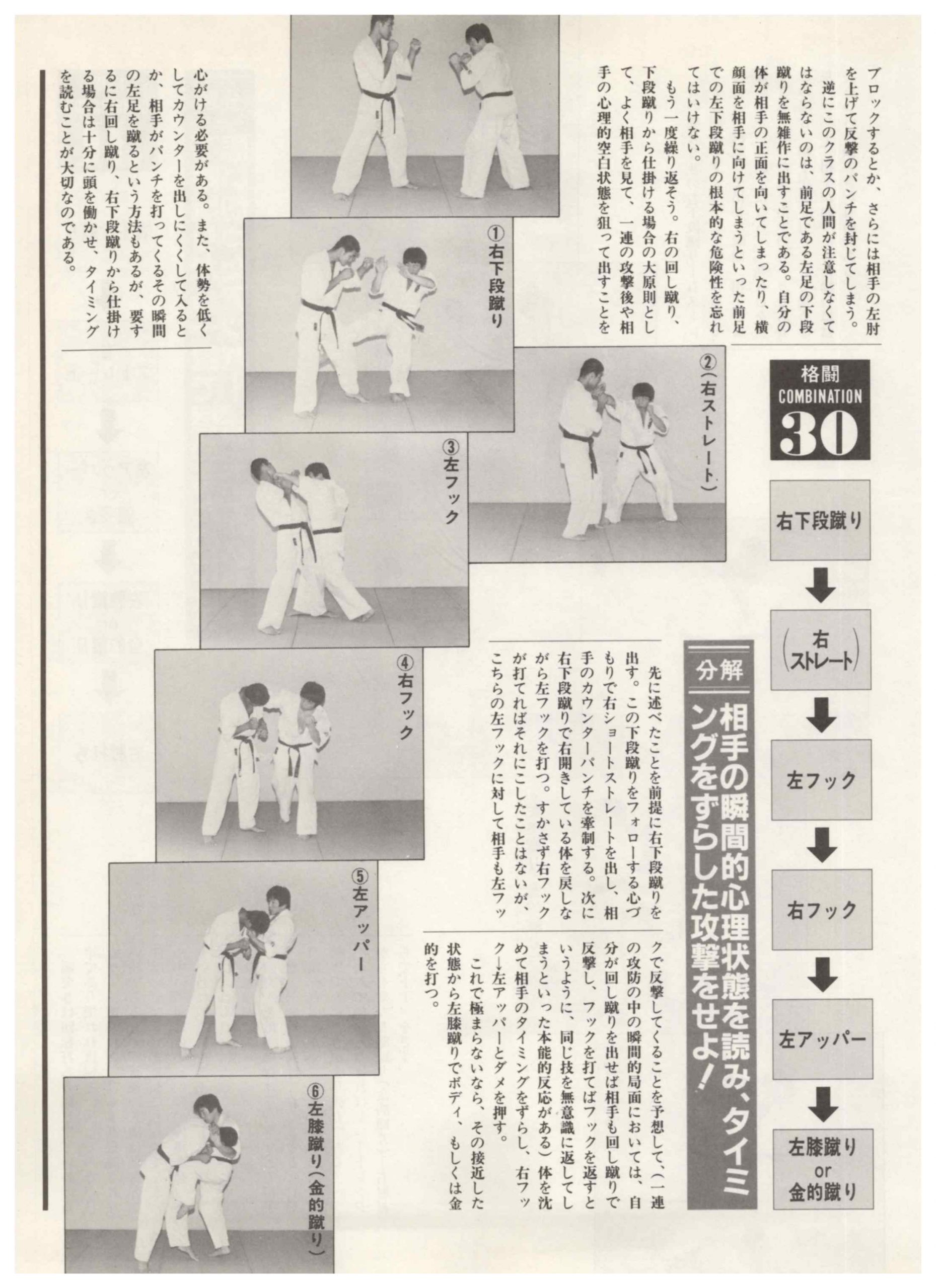東孝の格闘空手 空手リアルアーツシリーズ ⑩ VOL.2 2026年4月12日 by 大道無門 この連載は『月刊空手道』(福昌堂発行)1985年7月号に収録されたものです。肩書は掲載当時のものです 解説・指導 大道塾代表・東孝 ●協カ 長田賢一 一空手道リアル・アーツシリーズ1021世紀の空手!格闘空手の総帥・東孝が公開する超実戦空手のスーパーテクニック講座第10弾 格闘コンビネーション第四章第四章 回し蹴りからの連繋 3左回し蹴りによる仕掛け 分解 相手の瞬間的心理状態を読み、タイミ 分ングをずらした攻撃をせよ! 先に述べたことを前提に右下段蹴りを出す。この下段蹴りをフォローする心づもりで右ショートストレートを出し、相手のカウンターパンチを牽制する。次に右下段蹴りで右開きしている体を戻しながら左フックを打つ。すかさず右フックが打てればそれにこしたことはないが、こちらの左フックに対して相手も左フックで反撃してくることを予想して、(一連 の攻防の中の瞬間的局面においては、自分が回し蹴りを出せば相手も回し蹴りで反撃し、フックを打てばフックを返すというように、同じ技を無意識に返してしまうといった本能的反応がある) 体を沈めて相手のタイミングをずらし、右フック→左アッパーとダメを押す。 これで極まらないなら、その接近した状態から左膝蹴りでボディ、もしくは金的を打つ。