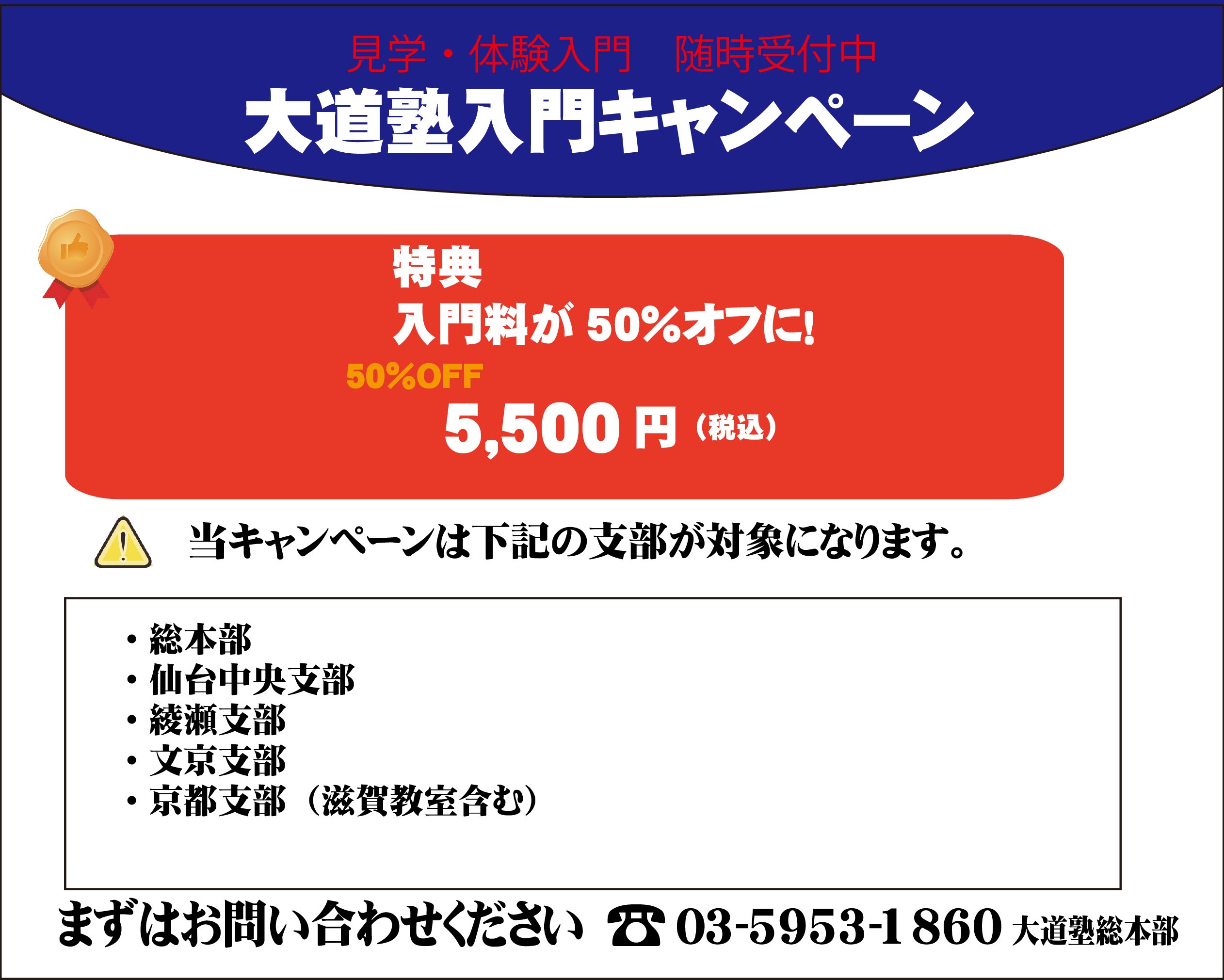 入門キャンペーンを実施いたします。 2025.12.26 by daido 期間:2025年12月25日(木)~2026年1月31日(土) キャンペーン対象支部:総本部・仙台中央支部・綾瀬支部・京都支部(滋賀教室含む)・文京支部 Related Posts 入門キャンペーンを実施いたします。 入門キャンペーンを実施いたします。 入門キャンペーンを実施いたします。