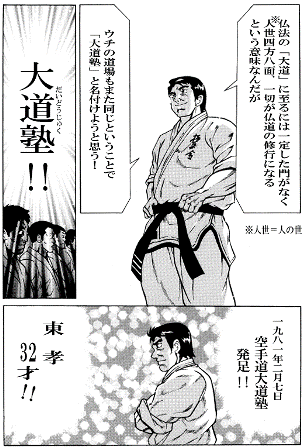 「大道塾」は強くなるための稽古・努力が『武道家としてだけでなく人間として完成する』ために役立つという信念から人間形成・教育の場としての道場であるという意味を込め『塾』という言葉を使っています。また「大道塾」の『大道』は「大道無門」大道に至るに門なし。即ち、人の世の全てが修行の糧、至高に辿り着く道程となりうるという言葉から借りており、先入観や、固定観念を避け、全てを抱含し、しかし一つには偏らない自由、開放を塾是としています。