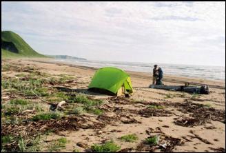 関野氏と私の自転車の旅は順調に南に進んでいました。予定ではサハリンの最南端クリリオン岬に着いてそこからカヤックで曽谷海峡を渡るという予定でしたがユジノサハリンスクを過ぎたところでクリリオン岬まで自転車で通れる道がないと分かりました。70キロ手前から岬まで何もないという情報が入りました。自転車で行けるところまで行き残りの距離を歩こうと決めました。道路はサハリン島の西海岸を通るため途中で山を越えなければなりませんでした。登り20キロ、下り20キロという今回が一番きつい山道でした。そしてクリリオン岬まであと70キロぐらいのところで道がなくなりここから歩くということになりました。昔日本時代のときにはここに車が通れる道があり、今は日本人が作った道路が部分的に残っていますが多数の川を渡る橋は壊れていて通ることができません。漁師さんと国境警備隊は大型前輪駆動のトラックで海沿いの浜をクリリオン岬まで走れるので私たちは同じ道を歩くことにしました。関野氏と二人で20キロぐらいの荷物を背負い砂浜を歩き始めました。カヤックで海峡横断の日程は決まっていたので70キロの距離を二日で歩かなければならなく、一日30キロというのは準備期間があればだれでも一日歩けば歩けるぐらいの距離ですが、私たちはいきなり歩き始めて、下は不安定な砂で、上は暑い太陽の光で結構大変な散歩になりました。初日は水ぶくれが足裏にできて二日目はそれを踏まないようにしたため、変な歩き方になり最後に膝関節が痛みました。夜は浜にテントで泊まりました。明日のために水を冷やそうと思い近くの川にペットボトルを沈めましたが朝になってみると潮で海に流されてしったので、次の日は飲まず食わずで出発しました。
