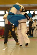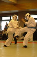 ■「2005第3回全国少年少女空道選手権大会」小学1・2年生(160以上)の部優勝の、塩釜支部飯坂健巧選手による選手宣誓。受けるのは矢島千秋大会会長(豊島区選出 東京都議会議員※)来賓として村井偵祐 豊島区体育協会専務理事にもご出席いただきました。