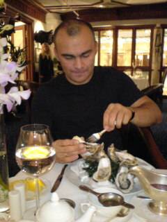平塚今日は計量なので少ししか食べられません「大変だな〜」と言いながらローストビーフをパクつく自分の右斜め前ぐらいに、ヒョードルに良く似た人が食事をしているのが見えました。平塚に「あの人ヒョードルに似ているなぁ」と言うと、そちらを見て「先輩!本物っすよ」と平塚が言いました。言われればそっくりさんにしてはリアル過ぎで、どうやら本人のようです。