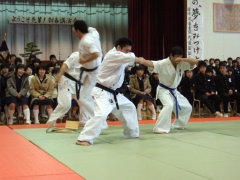 食事をすませ演武会を行う東先生の出身校、鹿折(ししおり)中学校へ向かいました。校舎の玄関へ行くと『ようこそ!先輩!』と書かれた今日の演武会の張り紙がそこらじゅうにしてありました。そして中から校長先生、教頭先生、他の先生方が迎えて下さいました。あまりの歓迎ぶりにこちらが驚いてしまいました。校長室へ案内されそこでお茶を頂きながら少しお話をしました。お二方とも運動が好きなようで教頭先生は伝統派の空手をやっていたそうです。演武をやる体育館へ移動する時には生徒達が『こんにちはー!』と元気良く挨拶をしてくれてとても気持ち良かったです。 体育館で着替えをすませリハーサルを行い、控え室で待っていると生徒達が体育館へ入ってきました。中学生だけでなく小学生や地域の住民の方もいます。最初に校長先生のお話がありそれが終わりいよいよ演武会です。