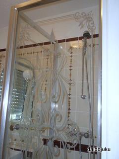 おしゃれなガラスに囲まれたシャワールーム(※ここは「おとぎの国」。決してビニールのカーテンの付いた無粋なユニットバスなんかではありません(^o^))で汗を流し、これもおとぎの国らしいふかふかのベッドと枕に「もっと硬いほうが好きだなぁ」と思いつつ、窓を開け放して就寝。おやすみなさい。