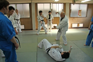 初めての合同稽古であり、東北地区予選大会直前ということで今回の合同稽古の内容は技の研究中心でした。稽古は2時間続いていましたが、1時間目は長田コーチ担当、2時間目はコノネンココーチ担当という割当になりました。前半の内容は空道の原点に戻って、礼法を始めとして基本、移動を徹底的に見直して、基本の技確認と統一を目的とされた。後半は、世界大会の課題の一つが体力不足と認識されたので、普段の稽古の時間内にウェイト器具を使わないで基礎体力作りを埋め込むというテーマでした。最後に世界大会の経験を踏まえて組技と寝技の応用技の紹介と指導が行われました。