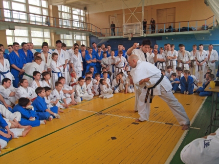 次の日に、先ずキエフのセミナー会場へ。今回の会場はウクライナ軍、指令本部直轄のスポーツクラブでした。サモーヒン支部長はとても戦略的な運営をしているため、最初に小さい町ルガンスクから初めて今はウクライナの27州の内に22州で支部があり、あらゆる機会を利用し空道のアピールをしています。今回も軍のスポーツクラブを会場として利用するのは軍を始めとして注目を集めるためでした。セミナー参加者は150人ぐらい、少年部から40、50代の大人まで、皆は目キラキラで東先生を神様のように見ていました。