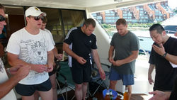 湾内の波の静かな場所に」クルーザーをとめ、ロシア人たちが次々に海に飛び込んでいきます。思い思いに海水浴、ウオーターバイク、釣りを楽しみます。第一回世界大会のチャンピオン、デニス・グリゴリエフも大はしゃぎです。結構みんな酔っぱらっています。ロシア人ってクールなイメージがあったのですが、よくしゃべるし、笑うし、イメージがずいぶん変わりました。