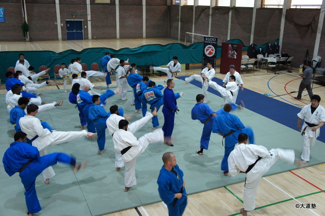 余談ですが、以前に、五十嵐支部長が審判として参加されたイギリスでの大会では、旗の準備が無くテーブルクロスをハサミで切り、笛が無く口笛で、演武の練習をするアナス支部長(イギリススラウ地区国内支部長)を横目に塾長と事務局長が即席のトーナメント表を作成etc.の経験を伺っていたので、今回はどんなことが起きるのやらと覚悟をしていきました。もちろん、事前に入念な連絡などで全て準備は万端のはずでしたが、、、諸々、準備が整っておらず、当日大変ではありましたが、前例のお話に比べれば、対応範囲内だったので、何事もなく(笑)無事終了しました。