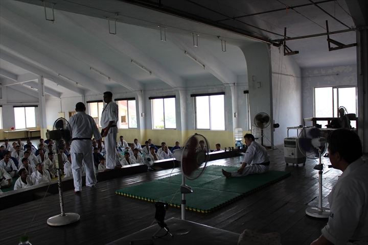 暑さに慣れてきたのか、渓谷の上に位置する校舎の窓から外の景色を眺めると、気持ち涼しくも感じる(一瞬(笑))。投げの講習のあと、40名の昇段審査。女性は2名受験。一人は警察官。想像はしていたものの、組手中、皆すぐマスクを脱いだり、横になったり。熱いので気持ちは分からなくもないですが、昇段審査なので・・・。あまり動きが機敏でなく無駄に時間が流れるので、3時間も過ぎると終盤、さすがに高橋師範が大声を上げ怒鳴りつける。それも当然な気もしました(笑)師範の一喝のお蔭か、約3.5時間でようやく終了。
