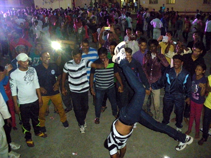 帰り道に轟音が聞こえてくる校舎へ案内され立ち寄ると、合宿全参加者が、子供も大人も踊り狂い、最後の日とは言え、学校の校庭がクラブ化している。小さい子供から中年の方までもがブレイクダンスやらバク転をして、日本で言う小学校から踊る盆踊り感覚?(笑)と思うほど、インドの文化にダンスは根付いていて、その文化のおもしろさを肌で感じながら、バランス力や体幹力は相当なものなのでは・・・?と感心しました。