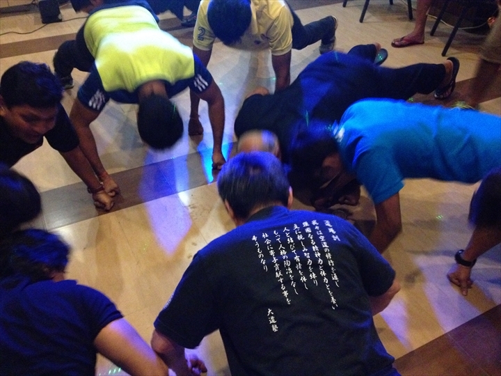 塾長の要望に応え、ムンバイ市内へ調達に戻ってカラオケを用意したそうですが、あまり日本のようには盛り上がらず。インド人のスイッチのON/OFFが段々見えてくる。塾長もそれを狙い、「昇段!!」のアメを武器に、強引に日本の空道イズムを浸透させ、塾長ペースの宴会となり無事終了。ホッ(笑)。遅くまで盛り上がり部屋に戻って気が付いたら朝方はお湯が出ず、冷房も動きませんでした。最後の1日だけでよかった・・・!