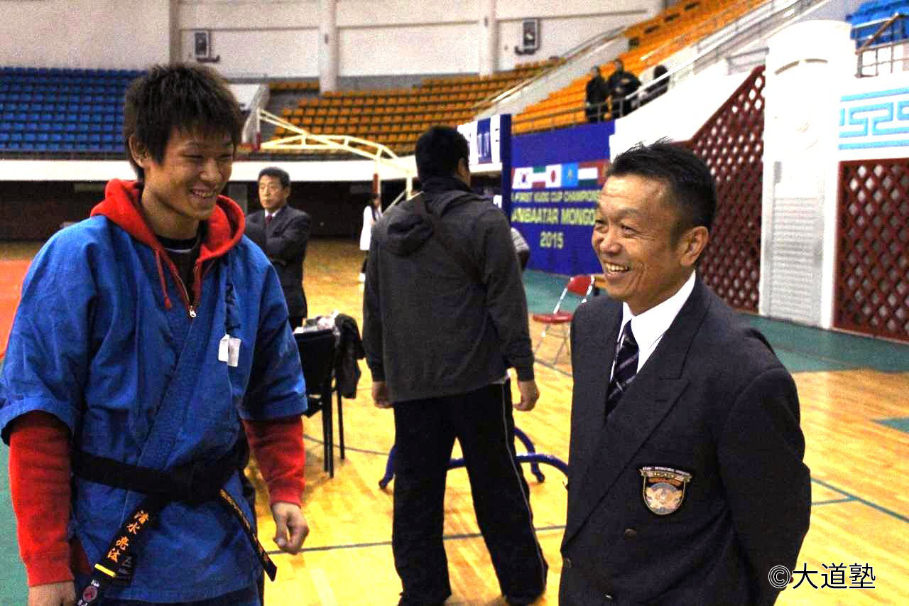 -230決勝で延長まで戦った二人。左はモンゴルのエンクバット選手、警察学校の先生