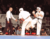 大道塾随一の体格を誇り、関西では無敵の藤田だが、全国大会となるとなぜか失速してきた。ところが一回戦では日本拳法の強豪・岡崎(青葉拳友会)をつかみからの右ストレートで下し、気迫を見せる。滝田戦でも右ストレートや、ローに返しのローを入れるなど新境地を見せて判定勝ち。滝田は背負いで見せ場を作ったが、たたき付けるのでなく前に引きずり落とすタイプのものだけにポイントが取れなかった。一工夫欲しいところだ。 |